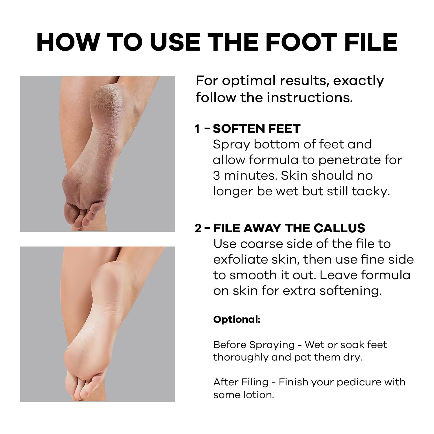 FOR FOOT CARE: Give yourself soft, luxurious baby-bottom feet with our foot scrubber set. The spray-on formula works like the callus remover gel and provides a softening treatment. Our proprietary blend serves as a dead skin remover for feet, hydrates dry skin, smooths cracked heels, and softens corns and calluses. Our foot rasp comes with a dual-sided stainless steel file that features two different grits to leave you with silky smooth heels.