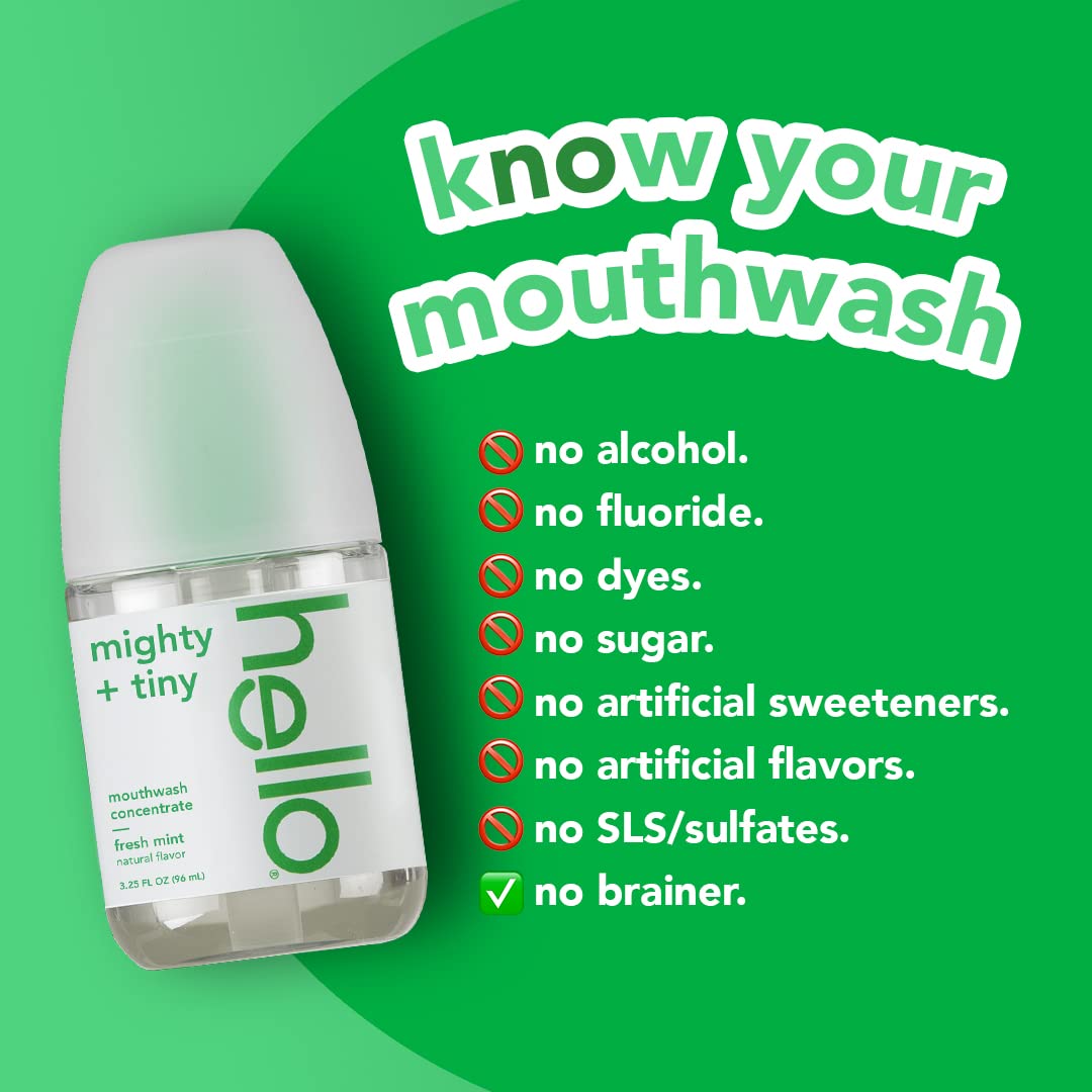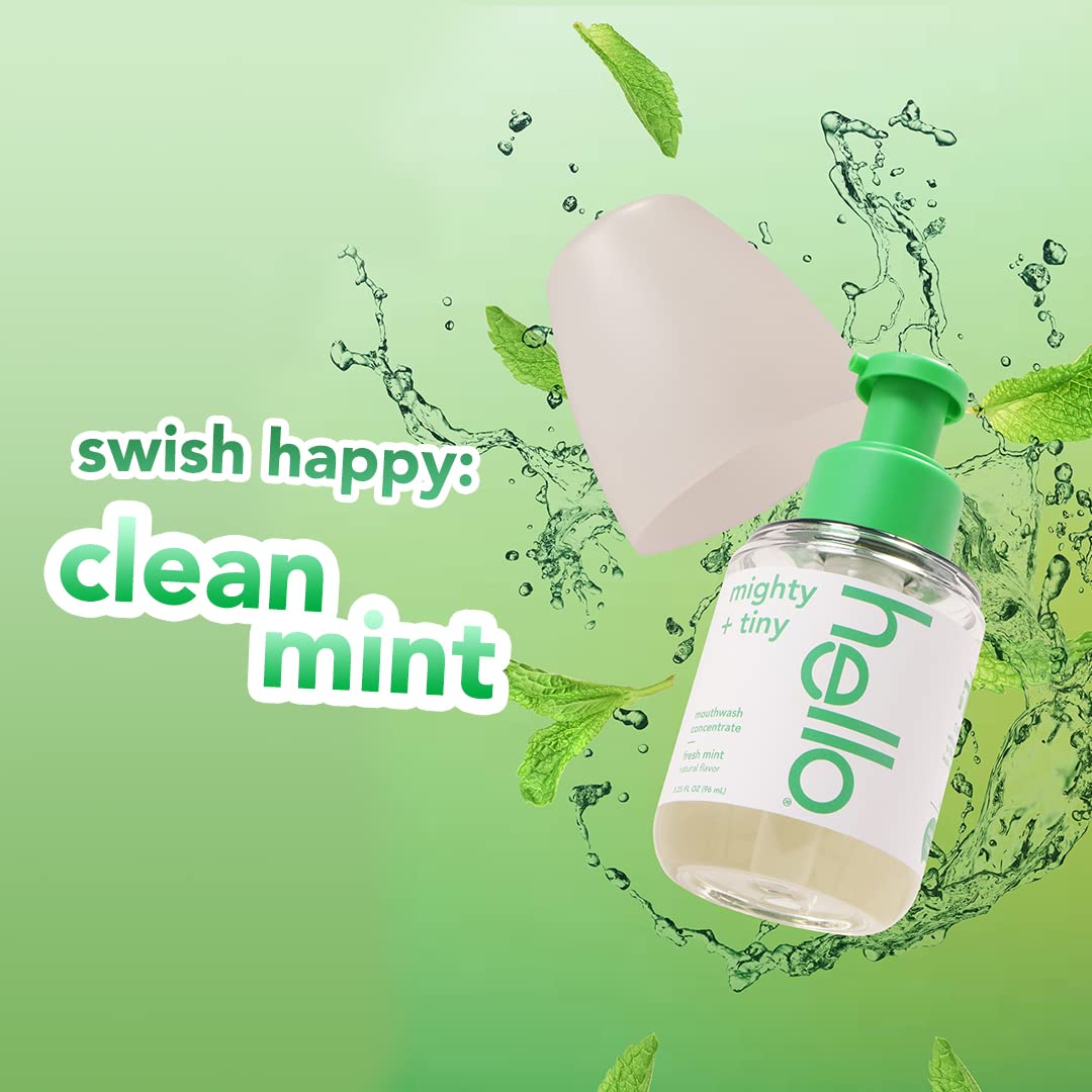 Less does more with Hello Fresh Mint Mouthwash Concentrate. Big and bulky mouthwash bottles are so last year. And the amount of plastic they use totally stinks. With our small, spitacular mouthwash concentrate, you get 34% less plastic* and 92% less water shipped per bottle of concentrate**. That means more doses for you.* This minty travel size mouthwash is more than a clever concentrate. It’ll also take your breath away—your bad breath, that is. The formula is made with a blend of farm-grown North American peppermint and Spearmint, so there’s delish in each swish. That blend helps freshen your breath and delivers natural menthol cooling. Plus, this alcohol free mouthwash helps rinse away the stuff brushing misses. And it moisturizes magnificently. With no dyes, SLS/sulfates, fluoride, sugar, artificial sweeteners or flavors, this bad breath mouthwash is a no brainer. Concentrate on the friendly with this travel-size bottle of Hello mouthwash for bad breath. *compared to a 16 FL OZ Hello adult mouthwash bottle dosed at 20 mL twice a day and using 2 pumps of concentrate twice a day **compared to a 16 FL OZ hello adult mouthwash bottle