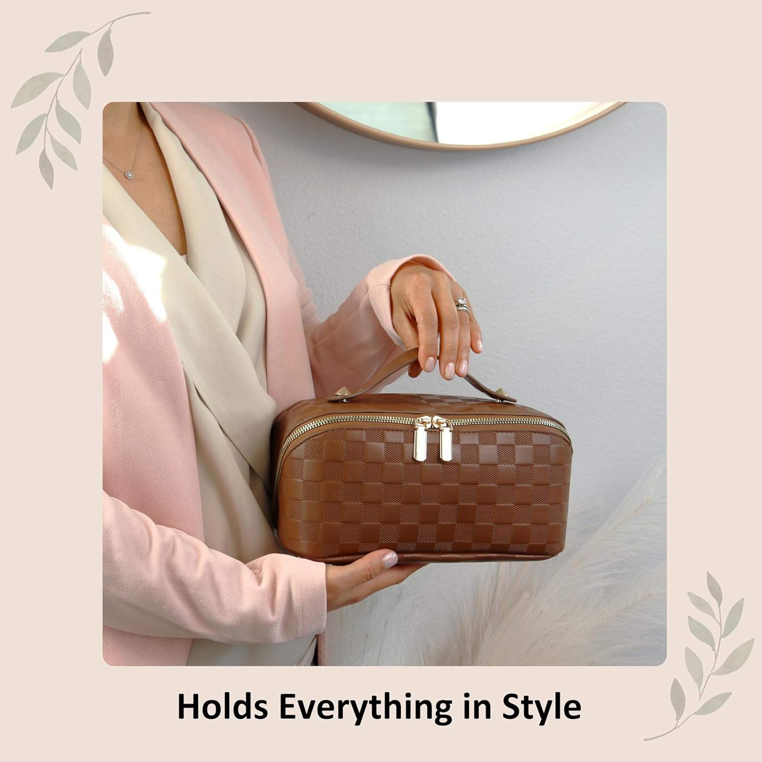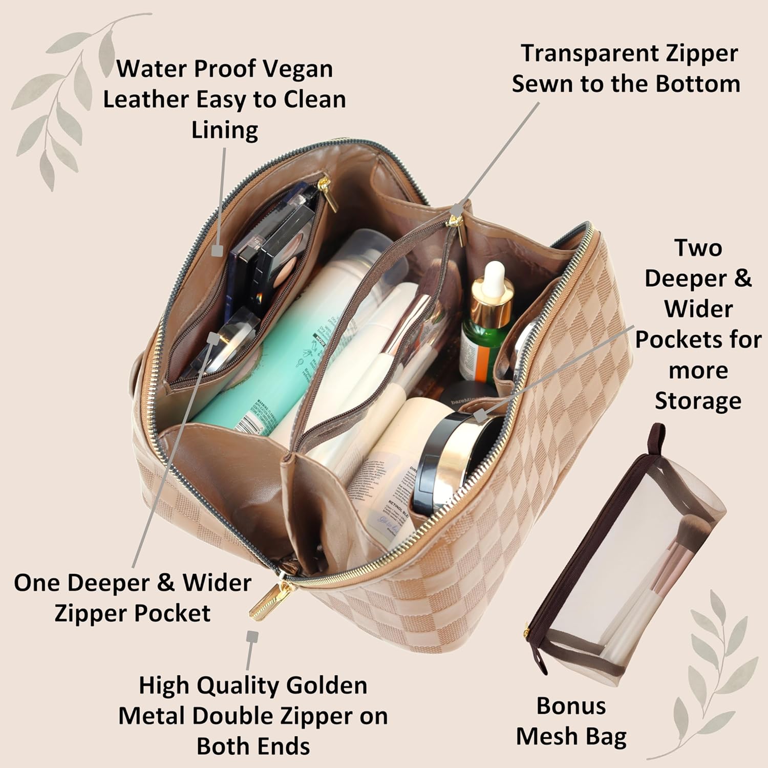 Eureka Finds Large Waterproof Large Vegan Leather Makeup Bag: It is essential for women who value beauty, style, and organization. This big makeup bag is more than just a bag; it’s a fashion statement. Crafted from high-quality vegan leather, it’s waterproof and easy to clean, making it the perfect travel toiletry bag. These toiletry bags for traveling women offer ample space to store all your cosmetics, skincare, and toiletries. It’s perfect for those who need pouches for organization. It has multiple compartments, pockets, and zipped sections to keep your items neat. It is an ideal choice as a makeup bag for the purse. With its compact design, it can easily fit into your luggage, making it a great travel makeup bag, cosmetic bag, and travel bag. Whether you need a sunscreen bag, makeup bag organizer, cosmetic travel bag, a calpak toiletry bag toiletry bag, or a cute makeup bag for your car essentials, this bag has got you covered. It’s also perfect as a checkered makeup bag, skincare bag, or a travel pouch. The Eureka Finds makeup bag can also serve as a toiletry bag for women, toiletry travel bag, small toiletry bag, and a toiletries bag. With this travel toiletries bag, you can say goodbye to makeup chaos. It’s designed for those who need a makeup bag large, a a makeup travel case, cosmetic pouch, a makeup organizer travel, travel case, and travel bags for toiletries. It’s also ideal for those who need a makeup bag with compartments, the best makeup bag for travel, leather cosmetic bags for women, and a makeup organizer bag for travel. This makeup bag is not just about function; it’s about style too. Its vegan leather gives it a trendy look, making it not just a makeup bag but perfect for those who value both style and practicality. It’s the best travel makeup bag, travel cosmetic case for women, travel makeup bag large, and makeup travel bag large you’ll ever own. This cosmetic bag is the perfect gift for women who love to stay organized.Vegan Leather Makeup Bag, Travel Essentials, and Beach Essentials provide a pouch for makeup brushes. perfect makeup bag, cruise ship essentials, airplane travel essentials fit on carry-on backpack. Desireable Checkered Pattern.