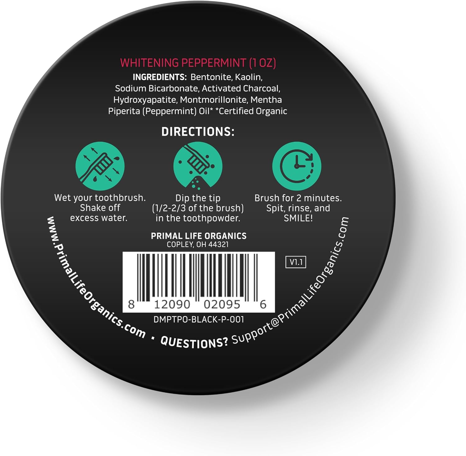 Primal Life Organics – Dirty Mouth Toothpowder, Activated Charcoal Tooth Cleaning Powder, Essential Oils with Kaolin & Bentonite Clay, Good for 200+ Brushings, Organic, Vegan (Black Peppermint, 1 oz)