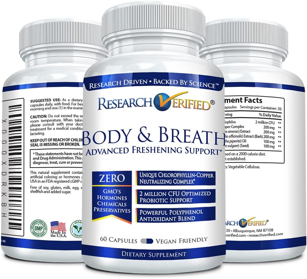 Research Verified Body & Breath is the most effective bad breath and body odor supplement on the market. Body and Breath Contains clinically proven ingredients that provide a multi-action, total care and management solution for bad breath and body odor. Body & Breath contains Lactobacillus Acidophilus, Chlorophyllin and Peppermint Oil for powerful probiotic intervention and therapeutic benefits.