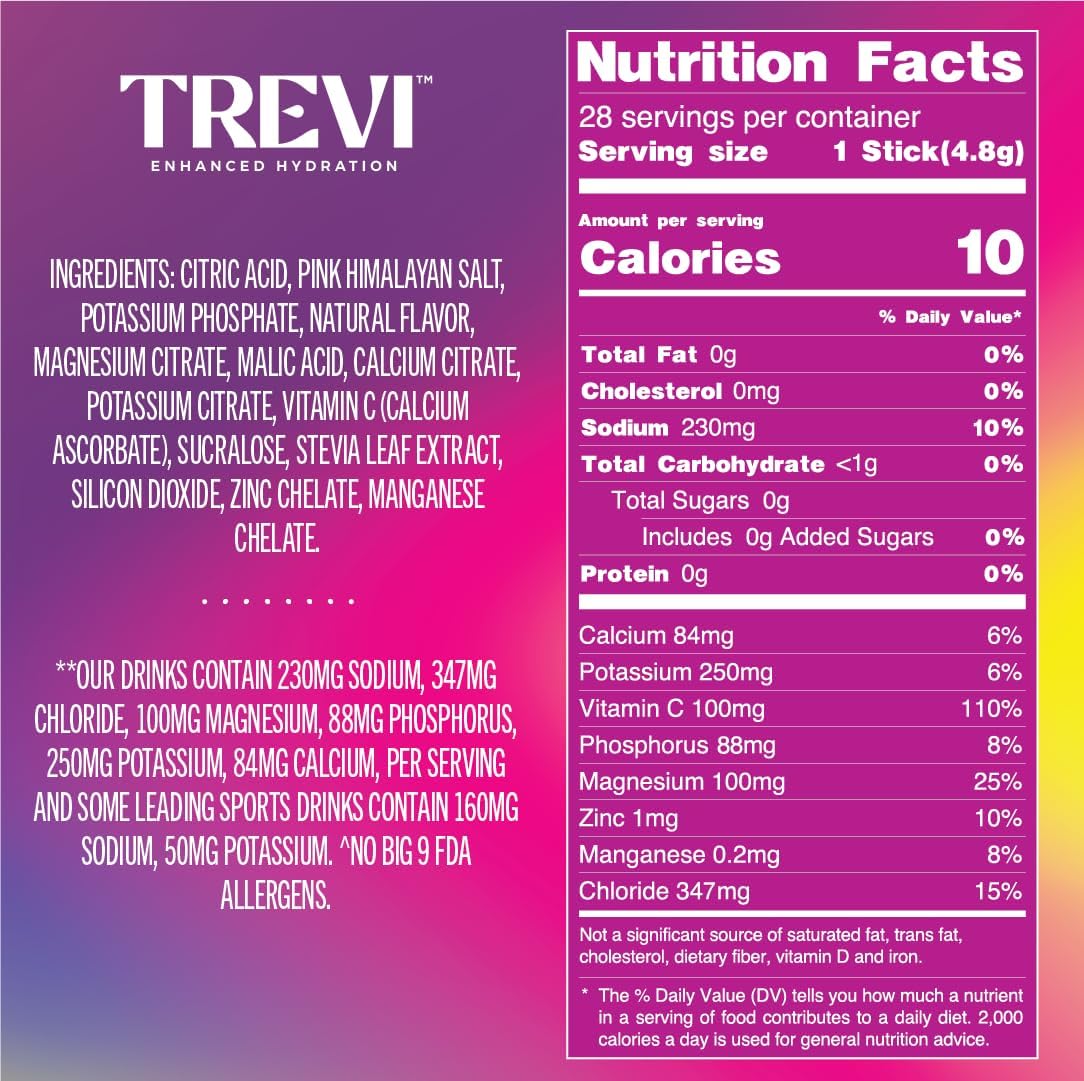 A Fountain of Flavor: At Trevi, we believe hydration should never be boring, which is why we developed a daily electrolyte powder hydration enhancer that doesn’t skip on taste while is also rich in vitamins, minerals and ingredients. With Zero Sugar, No Artificial Dye Coloring, Pink Himalayan Sea Salt, Trevi electrolytes are full of the good stuff while it hydrates and replenishes you throughout your daily life.